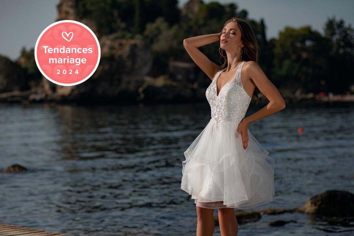 Ensuite, comme tenue de mariage civil, avec une seconde tenue longue pour une cérémonie religieuse ou laïque plus tard. C’est un schéma fréquent en France, où la mairie peut avoir lieu un autre jour. La robe courte convient alors parfaitement : elle accompagne la dimension administrative et symbolique sans chercher à reproduire l’effet de la cérémonie principale.